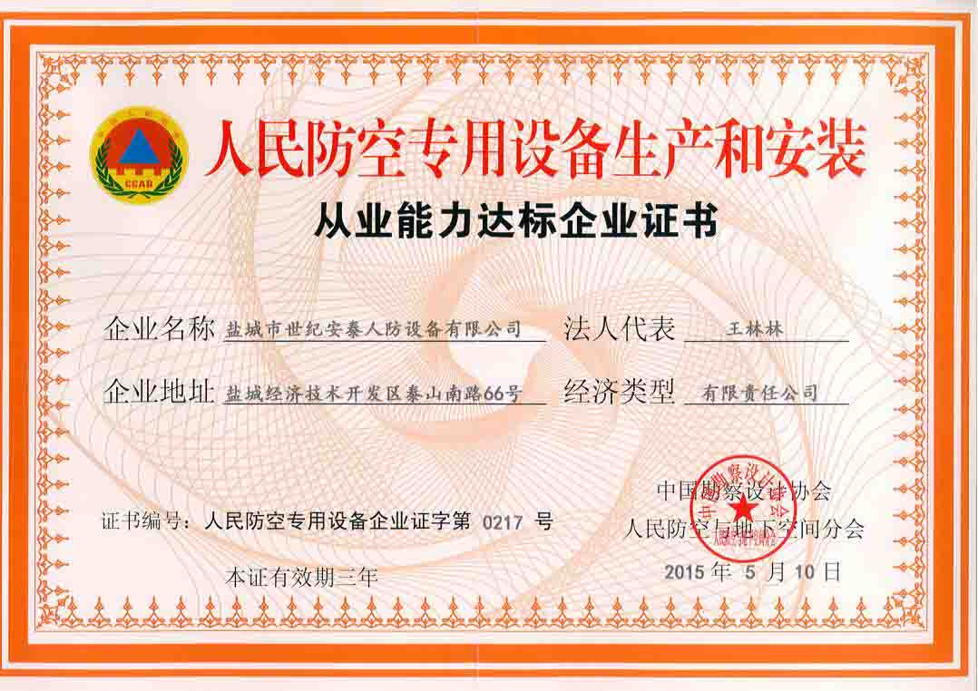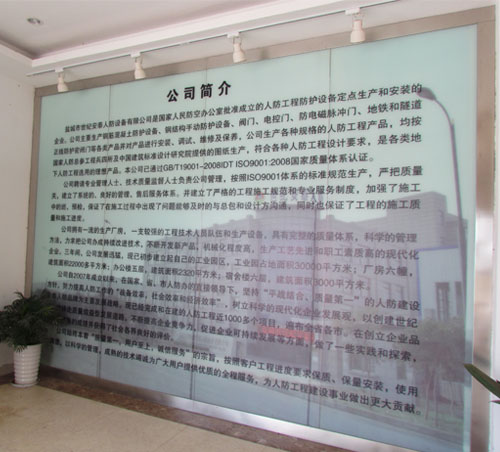 鹽城市世紀安泰人防設(shè)備有限公司是國家人民防空辦公室批準成立的人防工程防護設(shè)備定點生產(chǎn)和安裝企業(yè),是專業(yè)生產(chǎn)、銷售、安裝人防防護設(shè)備產(chǎn)品的企業(yè),公司主要生產(chǎn)鋼筋混凝土防護設(shè)備、鋼結(jié)構(gòu)手動防護設(shè)備、閥門、電控門、防電磁脈沖門、地鐵和隧道正線防護密閉門等各類產(chǎn)品并對產(chǎn)品進行安裝、調(diào)試、維修及保養(yǎng),公司生產(chǎn)的各種規(guī)格的人防工程產(chǎn)品,均按國家人防總參工程兵四所及中國建筑標準設(shè)計研究院提供的圖紙生產(chǎn),符合各種人防工程設(shè)計要求,是各類地下人防工程選用的理想產(chǎn)品。本公司已通過GB/T19001-2008IDT ISO9001:2008國家質(zhì)量體系認證。